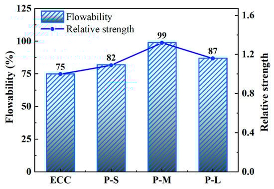Figure 4 shows the flowability of fresh mixes for each mix proportion. Changes in flowability significantly affect the fiber dispersion and workability of ECC, directly impacting its pseudo-strain hardening behavior and effective fiber utilization []. From Figure 4, it is evident that compared to ordinary ECC, the flowability of P-ECC is generally improved with the addition of PET aggregates. This is because PET materials are hydrophobic, absorbing less water during mixing than natural aggregates [], which increases the water–cement ratio and improves the flowability of the slurry.