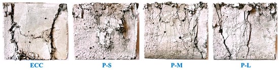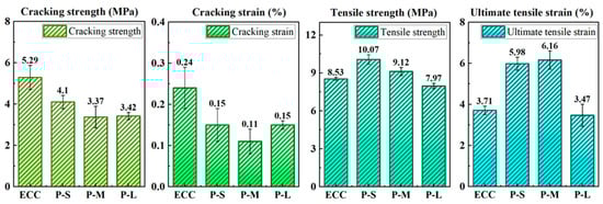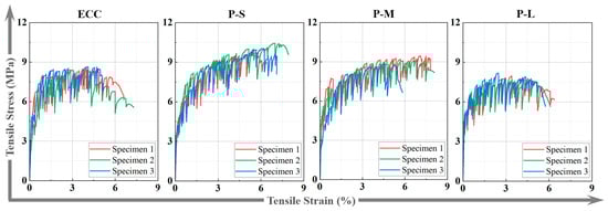 Figure 12 shows the tensile stress–strain curves of dog-bone-shaped specimens for each group. Under axial tension, all ECC specimens exhibit typical pseudo-strain hardening behavior, which is characterized by three stages in the stress–strain curve: the elastic stage, pseudo-strain hardening stage, and softening stage. The pseudo-strain hardening stage is directly related to the ductility performance of P-ECC. From Figure 12, compared to ordinary ECC, both P-S and P-M show longer pseudo-strain hardening stages, while P-L shows less variation. This indicates that P-S and P-M exhibit more significant multiple cracking behavior and can demonstrate superior ductility performance.