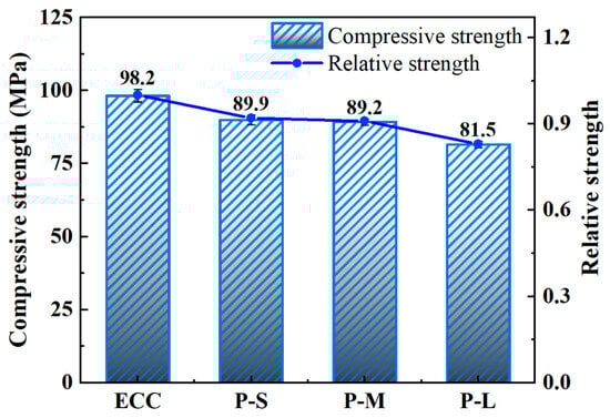 Table 6 and Figure 7 present the compressive strength of cube specimens with different mix proportions. The results in the table represent the average values of three specimens, with a standard deviation not exceeding 2.0 MPa. From Figure 7, it can be observed that the addition of PET aggregates reduces the compressive strength of ECC, and the size of the aggregates also influences the compressive strength of ECC. Specifically, the compressive strength difference between P-S and P-M is relatively small. PET-S aggregates have a larger surface area, leading to greater contact with the cement matrix. This extensive contact affects the bonding between the cement matrix and the aggregates, reducing the compressive strength of P-S. P-M has a lower density and larger pores, which also results in decreased compressive strength. Therefore, the difference in compressive strength between P-S and P-M is relatively small. In contrast, when replacing aggregates from PET-M to PET-L, the compressive strength decreases by 8.63%. This indicates that when the particle size of introduced PET aggregates reaches a certain size, it has a more pronounced negative effect on the compressive strength of the resulting material. From the perspective of the compressive strength mechanism of ECC, after matrix cracking, the PE fibers provide bridging capability. When the cracks reach a certain width, the PE fibers lose their bridging ability, leading to ECC failure. The wider cracks in P-L specimens, combined with the significantly lower elastic modulus of PET aggregates compared to quartz powder, cause PE fibers to lose this bridging ability rapidly, resulting in a significant reduction in compressive strength. Therefore, adjusting the particle size of PET aggregates can achieve superior compressive performance in ECC.