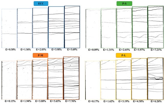 To observe the initiation and development of cracks during the tensile process, image binarization methods were employed to process segment images of the specimens under test, yielding crack distribution images at different tensile strains. Figure 8 and Figure 9 depict the typical failure modes and crack evolution process of P-ECC under tensile loading. It can be observed that all mix proportions of ECC in this study exhibited a ductile failure mode characterized by multiple crack initiation and propagation, with the trend in the number of cracks generally following the variation in tensile strain capacity. With the addition of PET aggregates, the number of cracks in the P-M sample significantly increased, somewhat alleviating the failure of the material. In contrast, the P-S material, which used smaller aggregates, was denser and more uniform, resulting in fewer additional cracks. Conversely, P-L, which used larger aggregates, exhibited wider cracks due to larger voids, and the number of cracks almost did not increase. Figure 9 illustrates that after applying the load, the specimen undergoes a brief period of elastic deformation. When the tensile stress at the weakest point exceeds the tensile strength that the matrix can bear, cracks initiate at that location, with PE fibers providing bridging. As the tensile load increases, the number of cracks continues to increase, and existing cracks expand. When cracks reach a certain width, the bridging effect of PE fibers significantly weakens, leading to gradual softening and failure of the specimen. Therefore, the strain capacity of ECC primarily originates from multiple cracking stages, where both the number and width of cracks are crucial factors that determine whether ECC can exhibit excellent strain capacity.