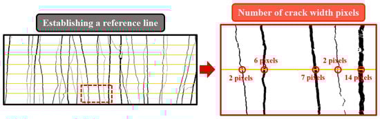 Figure 10 illustrates the quantitative analysis of the effect of PET aggregates on the multiple cracking behavior of ECC. Characteristic images processed through binarization were used to establish reference lines parallel to the direction of tension, counting the pixels at intersections between the cracks and reference lines to obtain specific crack parameters. Table 7 and Figure 11 present the average crack width and crack density obtained from processing various mix proportions.