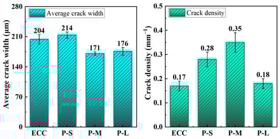 - An appropriate increase in PET aggregate particle size enhances P-ECC’s crack control ability, resulting in reduced crack width and increased crack density. Compared to P-S, the P-M samples showed a 20.1% reduction in average crack width and a 10.7% increase in crack density. However, when the PET aggregate particle size is too large (P-L), the crack control ability weakens due to stress concentration.