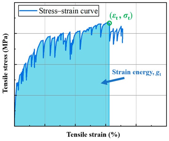 Strain energy is the energy absorbed by a specimen when forming a unit fracture surface during tension, providing a comprehensive assessment of the tensile performance of P-ECC in conjunction with tensile strength and ultimate tensile strain, as shown in Figure 14. The calculation of strain energy involves determining the area under the stress–strain curve within the integration range of [0, εt]. Table 9 and Figure 15 present the calculated strain energy results for the various mix proportions in this study.