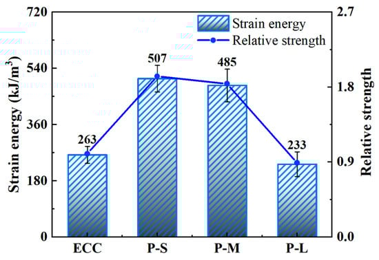 - Compared to ordinary ECC, the P-S and P-M samples showed improvements in tensile strength, ultimate tensile strain, and strain energy. P-S exhibited the highest increase in tensile strength and strain energy, with improvements of 18.1% and 92.8%, respectively. P-M contributed the highest increase in ultimate tensile strain, improving by 66.0%. In contrast, the P-L sample showed a significant decrease in tensile performance compared to the others.