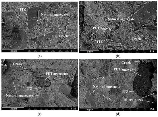 Figure 17 shows scanning electron microscope (SEM) images of the different mix proportions. In comparison, samples with P-S exhibit the smallest pores, and P-M and conventional ECC show moderate density, while P-L displays larger pores. In Figure 17b, the P-S sample at high magnification shows good compactness, possibly due to its smaller particle size and greater quantity, allowing for more uniform distribution within the concrete and, thus, a denser structure. In contrast, the use of PET-L reduces the density of aggregate packing, decreasing its ability to fill small voids and resulting in wider gaps around the PET aggregates. This structural characteristic causes stress concentrations during loading, thereby reducing the material’s strength performance.