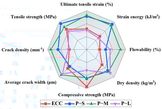 Figure 18 presents the comprehensive performance of each mix proportion, considering eight indicators: workability, dry density, compressive strength, average crack width, crack density, tensile strength, ultimate tensile strain, and strain energy. The axes are arranged radially from the center outward, with average crack width and dry density represented on the negative axis, and the rest on the positive axis. From the figure, it can be observed that the P-M sample exhibits the most balanced performance indicators, with the largest enveloping area, followed by P-S. Conventional ECC shows prominent compressive strength, while the P-L sample demonstrates better average crack width and dry density indicators. Additionally, both P-S and P-M show excellent ductility. In terms of tensile performance, P-S shows the best tensile strength and energy dissipation capability. From a crack control perspective, P-M exhibits the best average crack width and crack density. Therefore, in practical engineering applications, P-S can be chosen as the aggregate when emphasizing the ECC’s strength performance, while P-M is preferable when prioritizing the crack control capabilities of the material. Despite the negative impact of large PET aggregates on the produced composite, this study demonstrates how to strategically use different sizes of PET aggregates to optimize the mechanical properties of ECC. The results highlight the potential of small- and medium-sized PET aggregates to balance strength and deformability, thereby enhancing the overall performance of ECC.