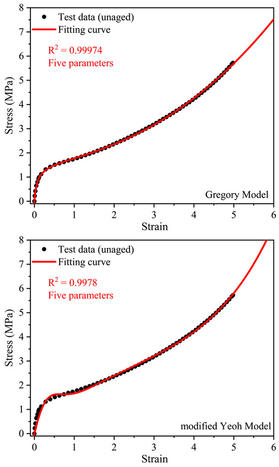 To check the applicability of the six top models, we fitted them to the test data in Figure 4, and the results are shown in Figure 5. It can be seen that the Davis–De–Thomas model, modified Gregory model and Gregory model can perfectly model the stress-strain data of the unaged EPDM, while the modified Yeoh model, Alexander model and Gen-Yeoh model do not. From Figure 5, we also can conclude that although the six models are successful in reproducing the stress-strain curve with strong nonlinear characteristics in the 100% strain range, when the strain is large those models are not all suitable. Models with fewer parameters and considerable modeling ability are considered to be the best models. Thus, the Davis–De–Thomas model with four parameters was selected as the constitutive model of the EPDM rubber.