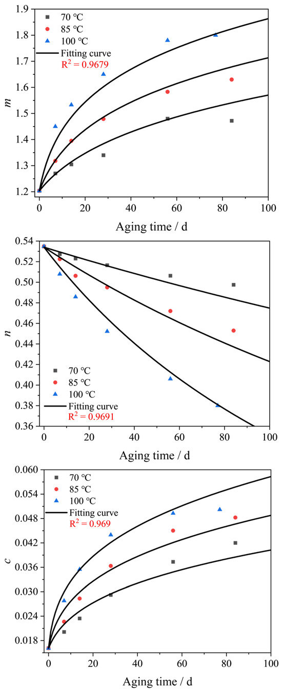 Equation (8) was used to fit the data in Figure 6 by the nonlinear least-squares method. Here, we employed the nonlinear surface fitting approach, which can fit parameters m, n, c and k of the three curves under three temperatures simultaneously. The fitting curves are shown in Figure 6. The R-square values for the aging model parameters m, n, c and k are 0.9679, 0.9691, 0.969 and 0.9059, respectively. Thus, the temperature- and aging time-dependent model parameters were established as Equation (9). Finally, the thermal aging model for the thermal-aged EPDM rubber can be expressed by combining the Davis–De–Thomas model and Equation (9).