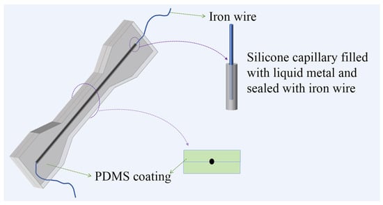 First, the LM GaInSn was injected into a 45 mm-long silicone capillary (0.5 mm, 0.8 mm, 1.0 mm). Two 20 mm-long fine iron wires were inserted into both ends of the silicone capillary containing GaInSn for sealing. The sealing operation could prevent the leakage of the GaInSn, which could lead to the circuit interruption before being encapsulated in the PDMS. Moreover, the other end of the wires could be connected to the external circuit after the sample preparation. Second, a certain amount of viscous PDMS prepolymer (Part A:Part B = 10:1) was poured (the thickness of PDMS was about 0.6 mm) into the dumbbell groove with depths of 2.0 mm and cured at 100 °C for 0.5 h. Third, the sealed GaInSn-containing silicone capillary was pressed onto the surface of the first PDMS layer, then the PDMS prepolymer (Part A:Part B = 10:1) was poured into the dumbbell groove until it was filled up, and then was also cured at 100 °C for 0.5 h. Finally, the PDMS/capillary GaInSn material was emoulded. The capillary GaInSn was embedded in the PDMS with the terminal of the fine iron wire exposed, as a result, the PDMS/capillary GaInSn material could be tested without being pierced. The resulting samples are shown in Figure 1.