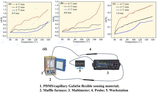 ΔR/R0 of the PDMS/capillary GaInSn flexible sensing material at different heating rates with the conductive path diameters of (a) 0.5 mm, (b) 0.8 mm, and (c) 1.0 mm. (d) Schematic diagram of the equipment connection for temperature sensitivity testing.