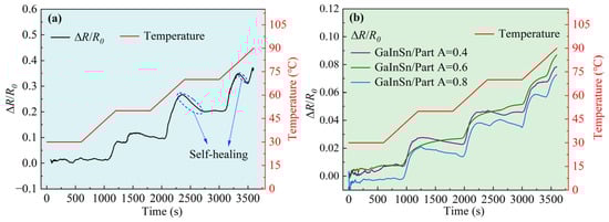 ΔR/R0 of (a) the PDMS/capillary LM flexible sensing material and (b) the PDMS + PDMS/GaInSn + PDMS sensor materials under a specific heating procedure.