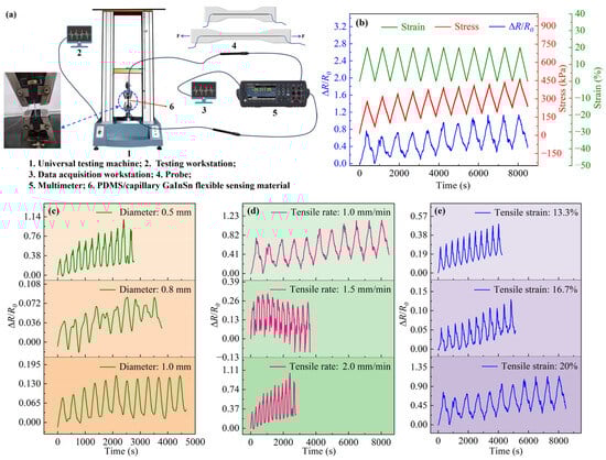 (a) Diagram of the stretching equipment connection. (b) Correspondence of stress, strain, and ΔR/R0 under the cyclic stretching operations. The ΔR/R0 evolutions of the GaInSn flexible sensing material samples under cyclic stretching operations: (c) tensile strain 20%, tensile rate 2.0 mm/min, diameters 0.5/0.8/1.0 mm, (d) tensile strain 20%, diameter 0.5 mm, tensile rates of 1.0/1.5/2.0 mm/min, and (e) tensile rate 1.0 mm/min, diameter 0.5 mm, tensile strains 13.3%, 16.7%, and 20%.