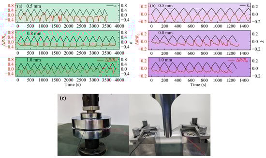 The ΔR/R0 evolution of the PDMS/capillary GaInSn flexible sensing materials with conductive pathway diameters of 0.5 mm, 0.8 mm, and 1.0 mm are shown in Figure 5b under the cyclic bending operations with a maximum k of 0.16. The ΔR/R0 of the samples also changed periodically with the k, on the whole, the resistance of the sensing materials was inversely proportional to the k. That is, to some extent, as the bending degree increased, the conductivity of the material increased. This was because, under bending conditions, the GaInSn in the conductive path was subjected to external forces, flowing in the direction with the maximum radial force and reducing potential energy. With the increase in the flowing capability of the GaInSn, the mobility of the free electron clouds increased, the ability to conduct current increased, and thus the resistance of the material decreased. The actual operation pictures of compression and bending are shown in Figure 5c.