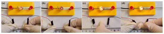 As shown in Figure 6, the brightness of the bulbs in the original, stretched, compressed, and bent states was consistent with the change trends of the resistance above, and the smaller the resistance, the brighter the bulb.