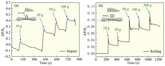 As shown in Figure 7, the PDMS/capillary GaInSn flexible sensing materials were tested under different intensities of impact or rolling pressure. The two small schemes on the upper left corner of the two figures displayed the impact and rolling measurement progress. The materials exhibited varying electrical signals under different levels of force. In Figure 7a, the resistance of the sample increased after impact and the increment of the resistance is proportionate to the weight of the impact weights. In Figure 7b, the resistance of the sample increases after rolling, and the magnitude of the resistance increase is also proportionate to the weight of the rolling weights. This was because, during the impact or rolling, the sample experienced radial compression due to external forces, leading to a sudden decrease in the diameter of the conductive path and an increase in resistance. Additionally, the flow capability of the LM GaInSn was restricted, hindering the movement of free electrons and resulting in an increase in sample resistance.