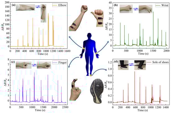 Based on the above research results, in order to determine the feasibility of the PDMS/capillary GaInSn flexible sensing material to monitor body movement signals, the material was pasted outside the finger joints, and inside the wrist joints and elbow joints and the sole of the shoes. The resistance changes of the material during the joint activity or stand up-crouch motion were recorded as shown in Figure 8. It can be seen from Figure 8a–c that the joint bending caused the resistance to become larger, and the joint recovery restored the resistance. It can be seen from Figure 8d that when squatting, the resistance increased, and when standing up, the resistance recovered. This demonstrated its potential application as a flexible biosensor.