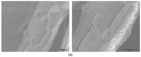 The micrograph of the basket 2/2 weave is represented in Figure 6c, and it is noticed that two warp threads pass together over two weft threads in a repeating pattern, giving a structure similar to a plain weave but with a more relaxed, bulkier texture. It is sometimes called a “double plain weave” due to its interlacing pattern. In this type of weave, the empty spaces between the warps and weft yarns are clearly visible, and this porosity will result in better soaking and infiltration of the resin system into the fabric itself.