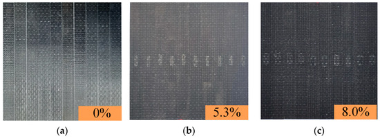 The water-soluble release agent (PARTALL FILM #10) was applied to prefabricate a resin-missing defect and ensure that there was no resin in that area, as illustrated in Figure 3. Depending on the size of the defect, the release agent was spread evenly on the fiber cloth, and the smeared area was pressed to completely saturate the fiber of the defective part. Afterward, the smeared area was heated to dry the surface quickly, and the other side of the fiber cloth was subjected to the same treatment. Finally, the VARI process was used to prepare composite laminates. The prepared specimens are shown in Figure 4.
