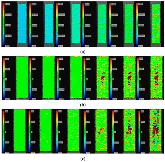 By comparing Figure 9b–f, it becomes apparent that a more significant strain change occurs at the defect site of the composite laminate during the stretching process. Moreover, the strain at the surface of the fiber bundle with defects rises sharply as the loading continues, in line with the obtained failure mode.