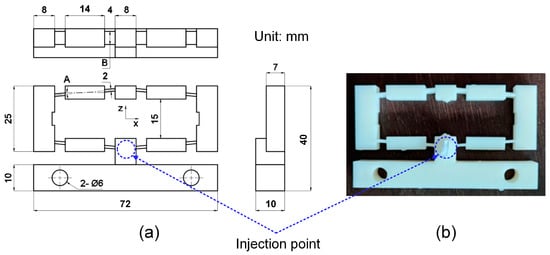 Injection molding is a popular technique that could produce plastic parts at a mass production level due to its advantages of industrial availability, high accuracy, short time, and affordable cost [,,,]. Injection molding, therefore, is widely applied in generating household products and industrial parts. Moreover, advanced injection molding techniques such as microinjection molding, gas-assisted molding systems, conformal cooling channels, metal injection molding, foam injection molding, and water-assisted injection molding have received much interest from authors [,,]. Injection molding can be applied with many thermoplastic polymers such as HDPE, LDPE, PP, ABS, and PA [,,,]. However, the reports about plastic flexure hinges generated using the injection molding process are rarely discussed despite the advantages of this fabrication technique.