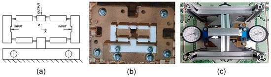 Compliant mechanism of the flexure hinge, fixture, and measurement device: (a) compliant mechanism, (b) fixture, and (c) measurement device setup [].