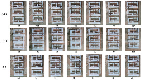 The flexure hinges at different plastics and injection conditions: (a) cooling time, (b) filling pressure, (c) filling speed, (d) filling time, (e) melt temperature, (f) packing pressure, and (g) packing time.