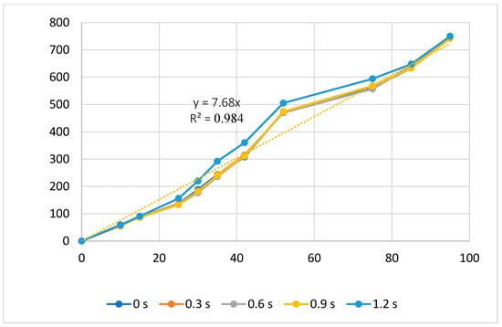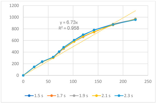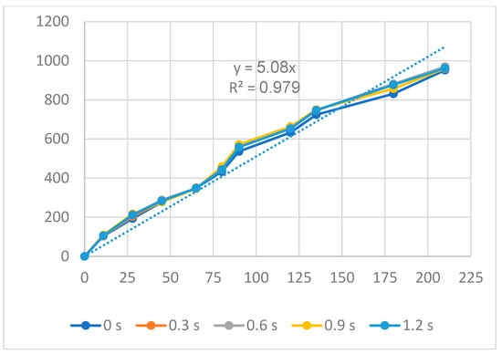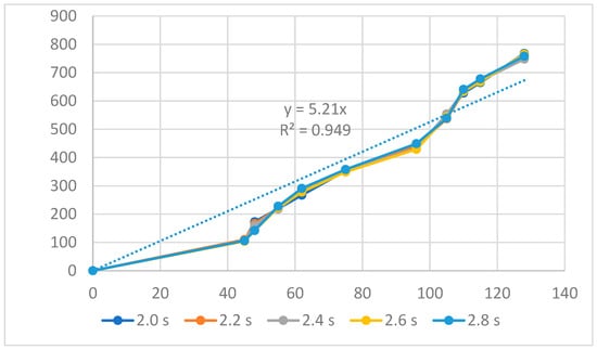 Figure 4, Figure 5 and Figure 6 present the displacement diagrams of the ABS flexure hinge at different filling times, filling pressures, and filling speeds. In the filling time case, with the maximum input value of 128 µm, the average output value is 760.4 µm, indicating the magnification effect of the hinge, as shown in Figure 4. Generally, changing the filling time, filling pressure, and filling speed does not strongly affect the displacement rate of the ABS flexure hinge due to the similar values of the curves at different filling times and filling pressures. In addition, improving the input value mostly leads to a linear increase in the output value. The regression equations between the average values of the input and the output displacements are