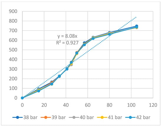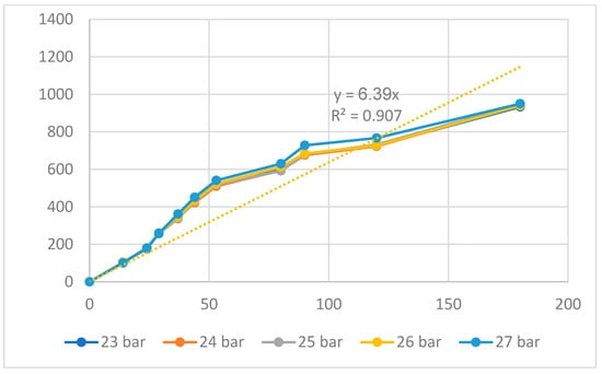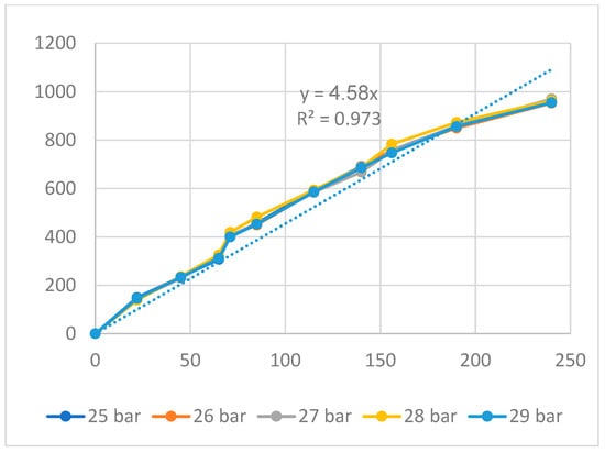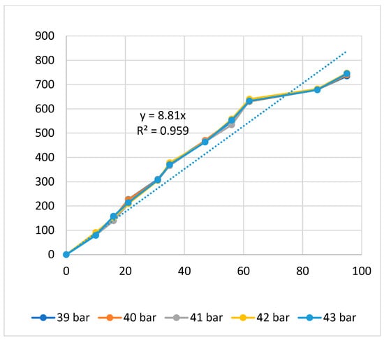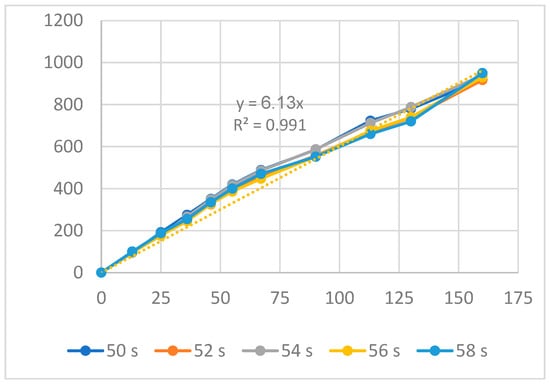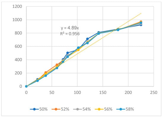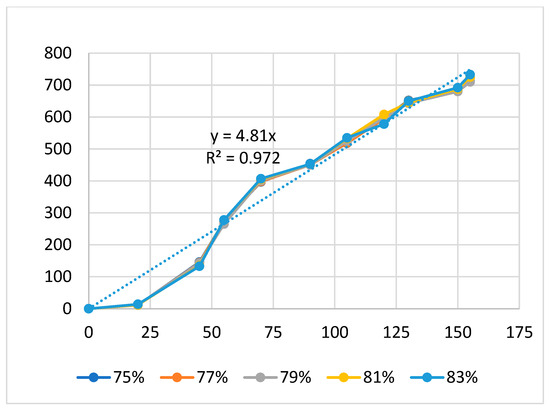 The trendline diagrams are set as a linear relationship y = a.x + b, where “b” is zero because the intercept of the trendline is set at zero. Therefore, there is only the “a” regression coefficient in the equation y = a.x. Moreover, the R-squared value of these trendlines is very high, which is higher than 0.9, indicating that the equation has a good prediction value.