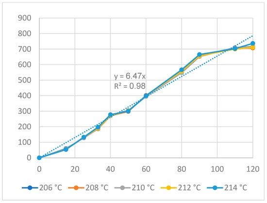 Figure 16 and Figure 17 display the displacement of the PP flexure hinge at different cooling times and melt temperatures. The curve diagrams of the various parameters in each figure are most comparable, demonstrating that changing the cooling time and melt temperature has little effect on the displacement rate. Furthermore, the regression equations between the average values of the input and output displacements are as follows: