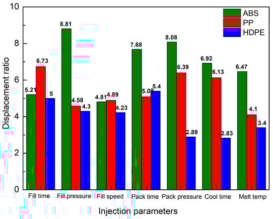 Overall, the amplification ratio values are 6.73, 4.58, 4.89, 5.08, 6.39, 6.13, and 4.1, corresponding to the filling time, filling pressure, filling speed, packing time, packing pressure, cooling time, and melt temperature. The filling time achieves the greatest amplification ratio, while the melt temperature has the lowest one. Notably, these values are mainly lower than the ABS flexure hinge because of the weaker strength. The amplification ratio of the ABS flexure hinge could range from 4.81 to 8.81, while the amplification ratio of the PP flexure hinge could range from 4.1 to 6.73. The suitable amplification ratio could be achieved using two methods: changing the plastic-type or changing the injection parameters. In the next section, the displacement of the HDPE flexure hinge is investigated and then compared to the PP and ABS flexure hinge. Furthermore, the PP flexure hinge’s linear relationship between input and output data is similar to the ABS one.
