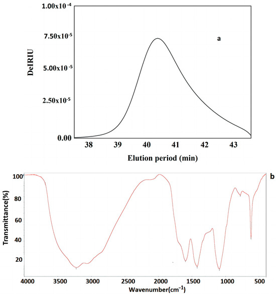 Figure 2b shows that the FVPT1 had three major absorption peaks at 3416, 1651 and 1453 cm−1. The 3416 cm−1 peak indicates the polysaccharide’s hydroxyl stretching vibration. The strong absorption peak at 1615 cm−1 and the weak peak at 1453 cm−1 illustrate the characteristics of the polysaccharide. No uronic acids were present because of the absent peaks at 1730 cm−1 [30].