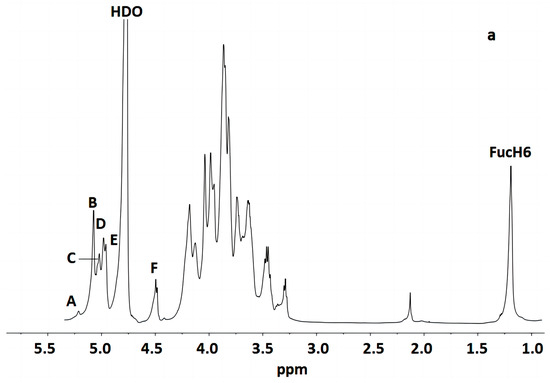 Figure 3 indicates that the polysaccharide structure of the FVPT1 included six sugar residues, named A–F, at δ 5.26 (single broad peak (br.s)), δ 5.12 (br.s), δ 5.07 (br.s), δ 5.03 (br.s), 5.01 (br.s) and δ 4.55 (double peaks (d), JH-1, H-2 = 6 Hz), respectively, corresponding to the signals at δ 101.55, 105.29, 100.73, 100.81, 104.20 and 105.87, respectively. A special signal at 1.24 (JH-5, H-6 = 6.42 Hz) showed the CH3-C group of the Fuc 1H signal, corresponding to the signals at C-6 of Fuc at δ 18.81.