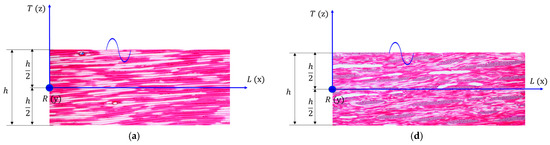 Sound propagation in spruce and maple wood depends on the type, organization, and three-dimensional shape of the anatomical elements of each species. In spruce wood (Picea abies Karst L.) in the longitudinal direction, tracheids constitute 90% of the wood volume and are approximately 100 times longer than they are wide, with them overlapping with adjacent cells both in the upper and lower parts by 20–30% of their length. This construction ensures the rapid propagation of waves in softwood [42,43,44,45]. In Figure 6a,c, the microscopic view in the tangential direction of spruce wood in relation to the measurement principle can be noted. In the radial direction, the transmitted waves meet the tracheids whose walls show thicknesses that increase from earlywood to latewood, so it can be considered a layered material (with each annual ring being a layer) (Figure 6b).