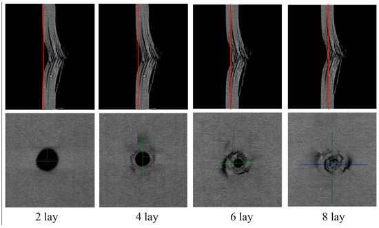 By slicing the 3D view along the thickness direction of the laminate, the damaged details of each layer of the laminate can be obtained. Figure 19 shows the CT images of the damage of each layer of the P2 layer test piece under 6.67 J/mm impact energy. From the figure, it can be seen that the industrial CT system is the best method for detecting low-velocity impact damage in composite laminated structures. Compared to the projection of all layer damage structures obtained by C-scan, the industrial CT system can clearly see the damage morphology and size of each layer from each profile, and can accurately measure the depth of the damage indentation. Based on the detection results of each layer, 3D damage area reconstruction can be performed very well.