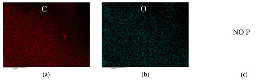 The SEM observations of the char residues after the combustion of EP/DDM and EP/DDM/VDPD-0.6, shown in Figure 15a,b, demonstrate that the EP char residues were smooth and flat, with only a small number of cracks being generated due to rapid cooling after stopping the combustion, and no outward protruding pores formed due to gas release from the inside to the outside. In contrast, Figure 15c,d show that the char residues of EP/DDM/VDPD-0.6 exhibited pores and honeycomb structures, as well as typical gas-jetting protrusions. The EDS elemental mapping of the char residues obtained from the EP/DDM and EP/DDM/VDPD-0.6 is presented in Figure 16.