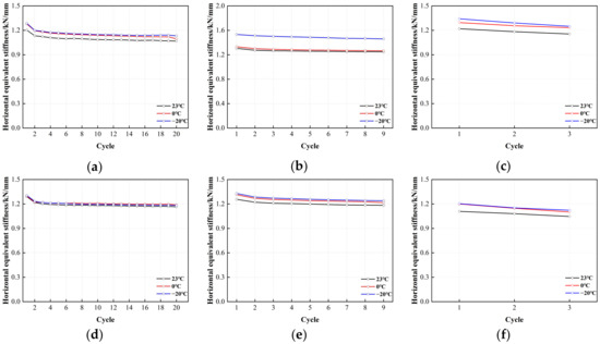 Figure 18 shows the correlation between the horizontal equivalent stiffness of LRB900 and the number of cyclic loading cycles. The horizontal equivalent stiffness of LRB900 varied with the increasing number of loading cycles, similar to its characteristic strength. (1) At 50% shear strain, the horizontal equivalent stiffness of LRB900 decreased from 8% to 19%, regardless of the temperature variations. (2) At shear strains of 100% and 250%, the characteristic strength of the bearing decreased with the increasing number of loading cycles, consequently leading to a reduction in horizontal equivalent stiffness. At a shear strain of 100%, the horizontal equivalent stiffness decreased from 25% to 28%. At a shear strain of 250%, the horizontal equivalent stiffness decreased by 13–20%. In addition, the horizontal equivalent stiffness demonstrated a noticeable temperature dependence under the conditions of 100% and 250% shear strain. Specifically, the horizontal equivalent stiffness increased with decreasing temperature. This behavior can be attributed to the significant increase in the load-carrying capacity of the lead core at lower temperatures.