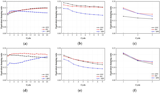The correlation between the equivalent damping ratio of LRB900 and the number of loading cycles is shown in Figure 23. According to the analysis, the equivalent damping ratio did not exhibit significant sensitivity to temperature variations across a range of shear strains. (1) Under the action of 50% small strain, the equivalent damping ratio of LRB900 fluctuates by 19–24%, and there is no significant temperature correlation observed. (2) Under 100% medium strain, the equivalent damping ratio of the support decreases by 17–39%, while under 250% high strain, the equivalent damping ratio of the support decreases by 23–35%. (3) At medium and large strains, the equivalent damping ratio of LRB900 gradually decreases due to the heating and softening effect of the lead core, indicating that the energy dissipation capacity of LRB900 bearings gradually decreases.