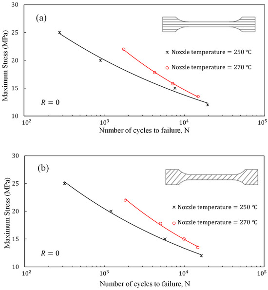 As illustrated in Figure 9b, the viscosity of the ABS/GNPs nanocomposite material with a 1.0 wt.% GNP concentration at a temperature of 270 °C and a shear rate of 25 rad/s closely mirrors that of ABS at 250 °C, the designated temperature for 3D printing pure ABS samples. Increasing the nozzle temperature from 250 °C to 270 °C would reduce the die-swell effect, resulting in better quality of the extrudate and 3D-printed samples. Fatigue tests of the samples were conducted at a frequency of 0.5 Hz and a stress ratio of zero to prevent buckling. A minimum of three samples were tested at each load level, and the maximum stresses were plotted against fatigue lives. The fatigue test results of the composite samples fabricated with the nozzle temperature of 270 °C were then compared with those fabricated under the same conditions as pure ABS.