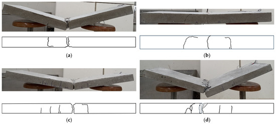 Table 5 summarizes the number of cracks observed on the surfaces of the specimens, while Figure 8 illustrates the surface damage and final failure modes after testing.