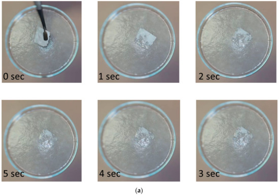 Disintegration tests were conducted both in a simulated moist tongue environment, using a filter paper wetted with artificial saliva, as well as in water. Upon contact with the wet filter paper (Figure 8a), the fibrous mats displayed spontaneous disintegration and liberation of the active substance. Similar characteristic was observed when the FEN-loaded HP-β-CD fiber mat was immersed in water (Figure 8b), where the disintegration occurred within 1 s. The rapid disintegration can be attributed to the combined effect of the high porosity and high surface-to-volume ratio of the fiber mat, the amorphous nature, and the high solubility of the CD derivative.