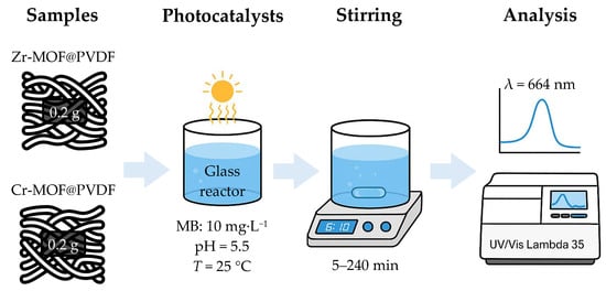The photodegradation of 95% methylene blue (Sigma Aldrich, St. Louis, MO, USA) was conducted using a glass reactor containing the MB solution (10 mg L−1) with a controlled pH = 5.5 and T = 25 °C (±1 °C). The photocatalyst (e.g., Zr-MOF@PVDF and Cr-MOF@PVDF) was immobilized on a glass substrate, wherein 0.2 g of Zr-MOF@PVDF or Cr-MOF@PVDF were used. The system was stirred continuously within 5 to 240 min, and samples were taken regularly to monitor degradation using UV–Vis spectroscopy at λ = 664 nm. The degradation efficiency was calculated. Blank tests were performed for comparison, and reusability studies assessed the catalyst’s stability over multiple cycles. The optical absorbance spectra of MB were analyzed using a UV–Vis Lambda 35 spectrophotometer (PerkinElmer, Waltham, MA, USA). A basic diagram of the overall photocatalysis process is shown in Figure 1.