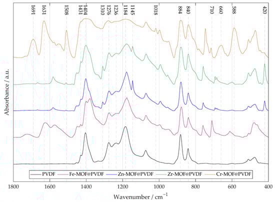 The FTIR of four types of PVDF nanofibrous membranes with MOF based on iron, zinc, zirconium, and chromium. A pure PVDF fiber membrane is added for reference. For MOF-based materials, metal–oxygen bonds are typically found at lower values of ∼800 to 600 cm−1. Other several important peaks are marked in the spectrum indicating the specific vibrational–rotational motion described in the paper.
