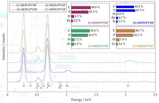 A summary EDS spectrum in Figure 4 confirmed the presence and content of all the important elements expected in the nanofiber material. The spectrum was obtained from a sample map of sufficient size 250μm × 250 μm. The accumulation from such a large area provided that the MOFs would be detected with high confidence, and their distribution is more uniform. The curves for all four materials studied are shown in the plot, and their elemental percentages are summarized in the bar chart for each composite separately. The percentages of the materials are roughly similarly distributed, which was the goal during the design and synthesis of the electrospinning solution. The highest occurrence of peaks was within the 2.5 keV level, so the plot was modified accordingly. Since some peaks overlap, it is not possible to visualize all of them, but it is possible to identify their location by their known value. Chromium in Cr-MOF@PVDF and iron in Fe-MOF@PVDF have intensities that are small and overlapped by oxygen and fluorine peaks, respectively. For Zn-MOF@PVDF, nitrogen, which is part of Zn-MOF, more precisely its ligand, was also detected; see description in Section 2.1. Compared to the other composites, the highest amount of metal was detected in the Zr-MOF@PVDF, namely 6.4% of zirconium.
