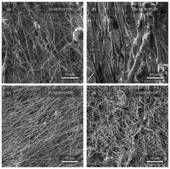 Detail of the nanofibers with MOF from a view field of 10 μm. In the micrographs, the PVDF with MOF based on (a) iron, (b) zinc, (c) zirconium, and (d) chromium can be observed.