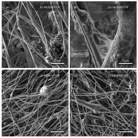 A closer look at the capture and implementation of MOFs in fibers is provided in Figure 6. Several interesting details can be observed in different cases with varying coverage of MOFs. In Figure 6a, the Fe-MOFs have the shape of spheres that are attached to the fiber in a group of larger clusters. The diameter of the fibers usually does not exceed 1 μm. Zn-MOFs are trapped in similar clusters in Figure 6b. However, here, the fibers reach a multiply larger and more variable diameter in the range of hundreds of nanometers to units of micrometers. The porous structure of the individual fibers may prove interesting. It is also noticeable that there is a soft “web” between the fibers, which may be due to insufficient evaporation of the solvent during electrospinning. The evaporation of the solvent can be controlled by changing the parameters during the fabrication itself when the result is most predictable. However, the fibers can also be dried after spinning. In Figure 6c, the Zr-MOFs are trapped in small amounts, manifested by a slight diameter expansion of the fiber. Even here, a defect in the form of a balled-up polymer can be noticed. From the last image in Figure 6d, Cr-MOFs quite clearly resembles pyramidal structures with rectangular bases []. The thickness of the fibers is fairly comparable to the dimensions of Zr-MOF@PVDF. On closer examination, even the parallel orientation of the fibers, which was not obvious from Figure 5d, can already be distinguished.
