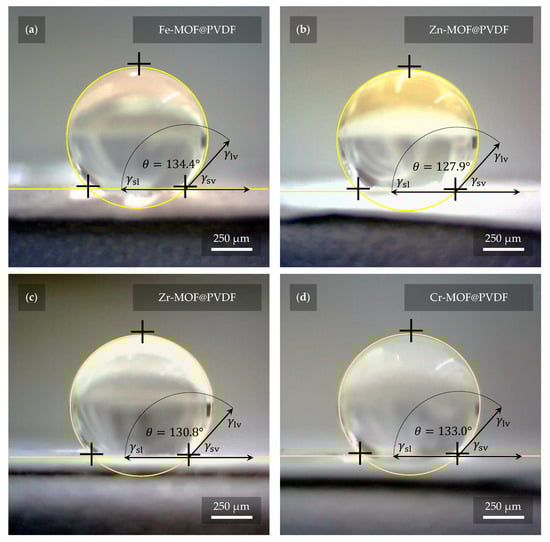The highest hydrophobicity was measured with a value of 134.4° on sample (a) Fe-MOF@PVDF, while the lowest was measured on sample (b) Zn-MOF@PVDF with a value of 127.9°. Samples (c) Zr-MOF@PVDF and (d) Cr-MOF@PVDF had values of 130.8° and 133.0°, respectively. However, these are quite small differences, and thus it can be considered that the presence of MOF in the nanofibers does not contribute significantly to the different hydrophobicity of the fibers. The fibers without MOFs show 129.5° according to our measurements.