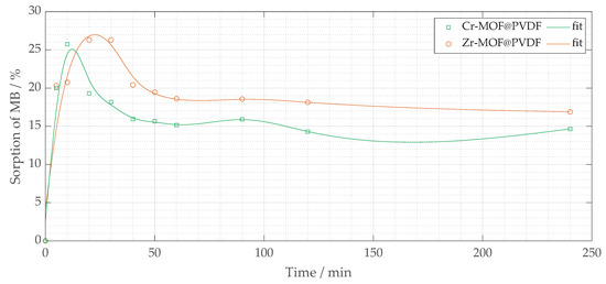 Among the two composites, Cr-MOF@PVDF fibers demonstrated higher initial sorption efficiency, achieving approximately 25 to 27% MB removal within the first 50 min (mainly within 20 min), suggesting a higher affinity or greater availability of active sites compared to Zr-MOF@PVDF fibers. In contrast, Zr-MOF@PVDF fibers had a somewhat lower initial sorption efficiency, ranging from 20% to roughly 15%. After 150 min, both materials’ sorption capacities stabilized. Notably, Cr-MOF@PVDF fibers maintained a higher MB sorption percentage than Zr-MOF@PVDF, indicating a greater equilibrium sorption capacity. However, after 150 min, a slight fluctuation or decline in sorption was observed for Cr-MOF@PVDF, potentially due to the desorption of MB from the fiber surface or the limited stability of the Cr-MOF@PVDF composite under test conditions.