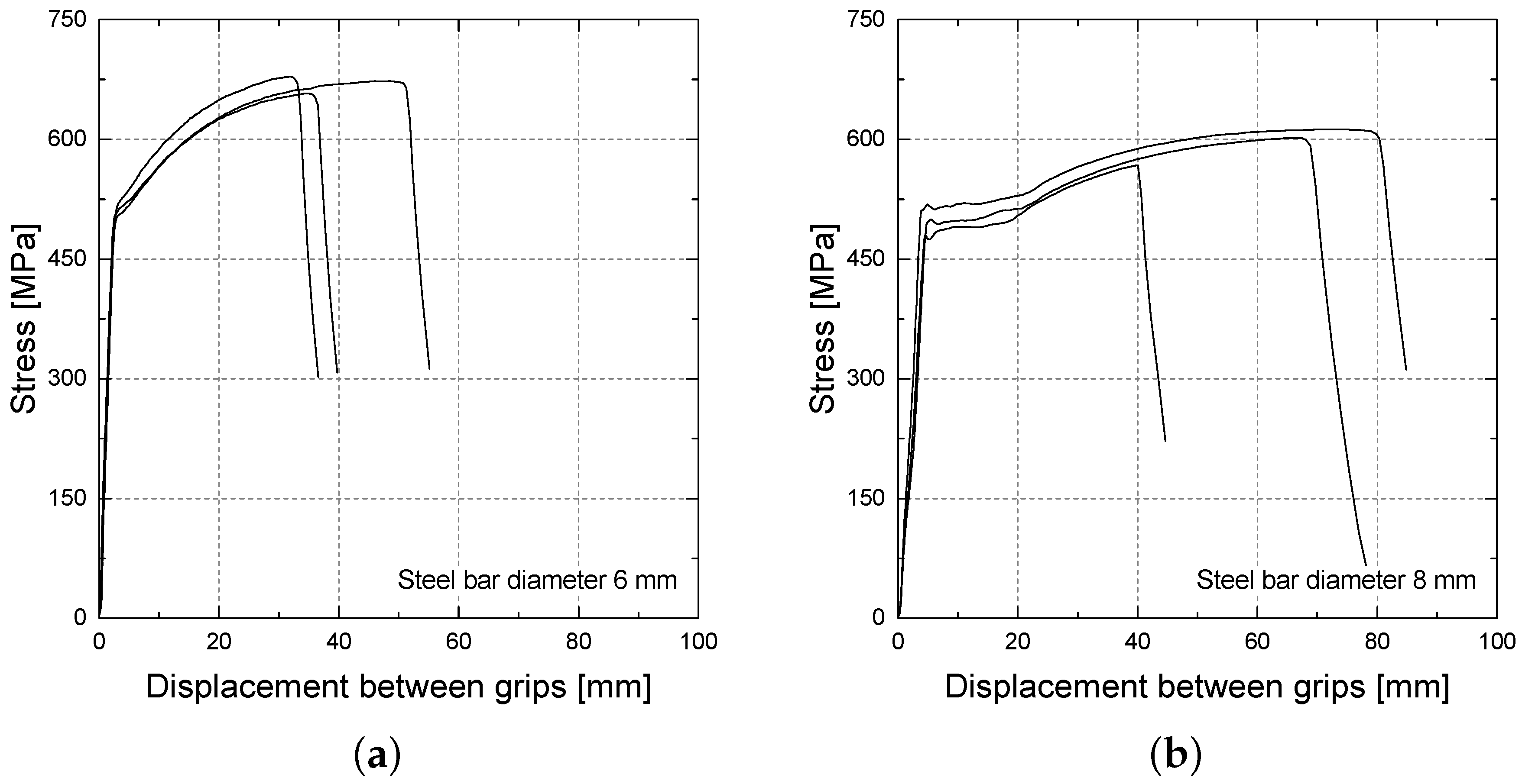 Tensile stress vs. displacement between grips of (a) ∅6 steel bar; (b) ∅8 steel bars.
