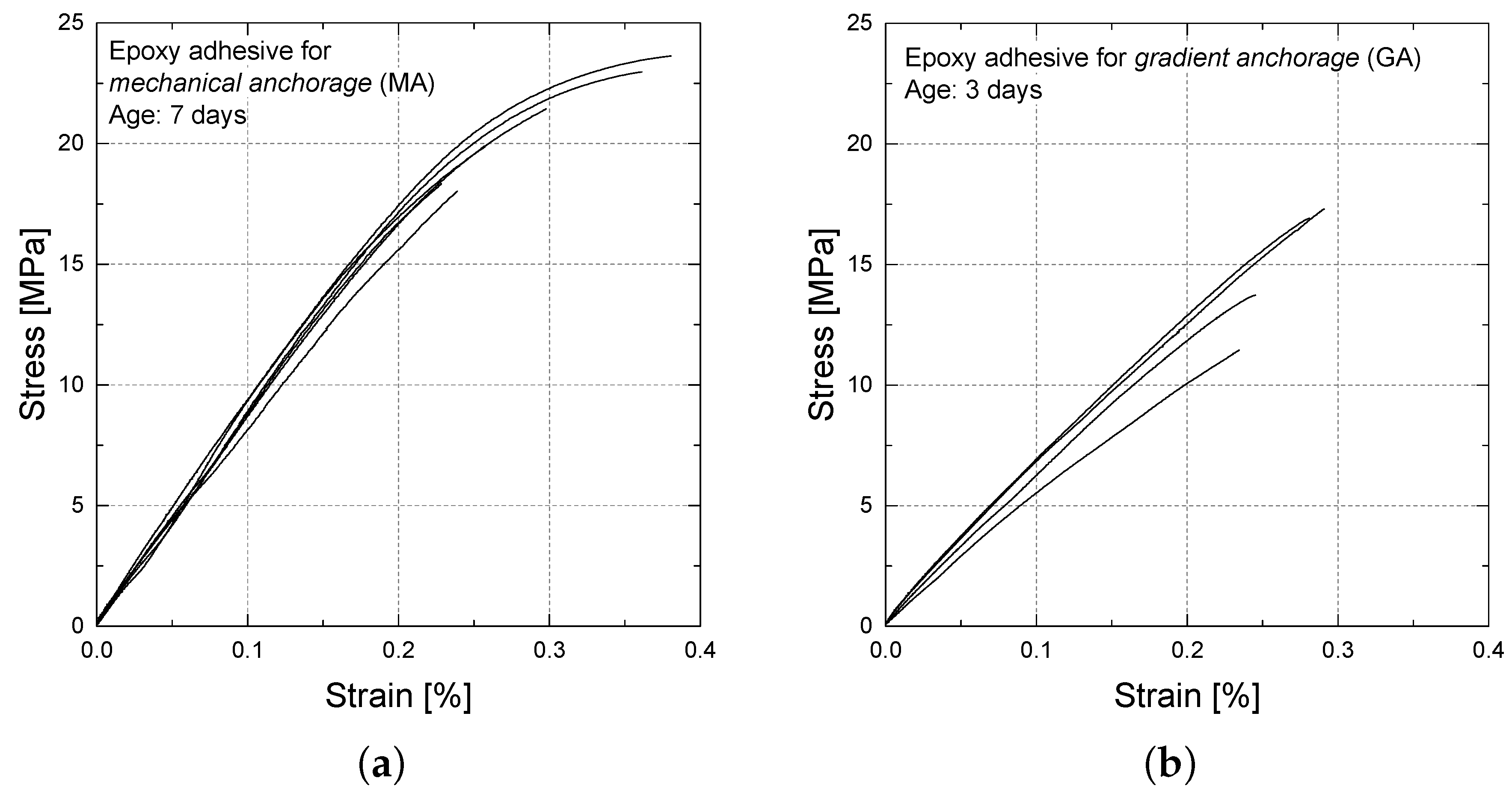 Tensile stress vs. strain of epoxy adhesive used with (a) Epoxy adhesive for MA; (b) Epoxy adhesive for GA.
