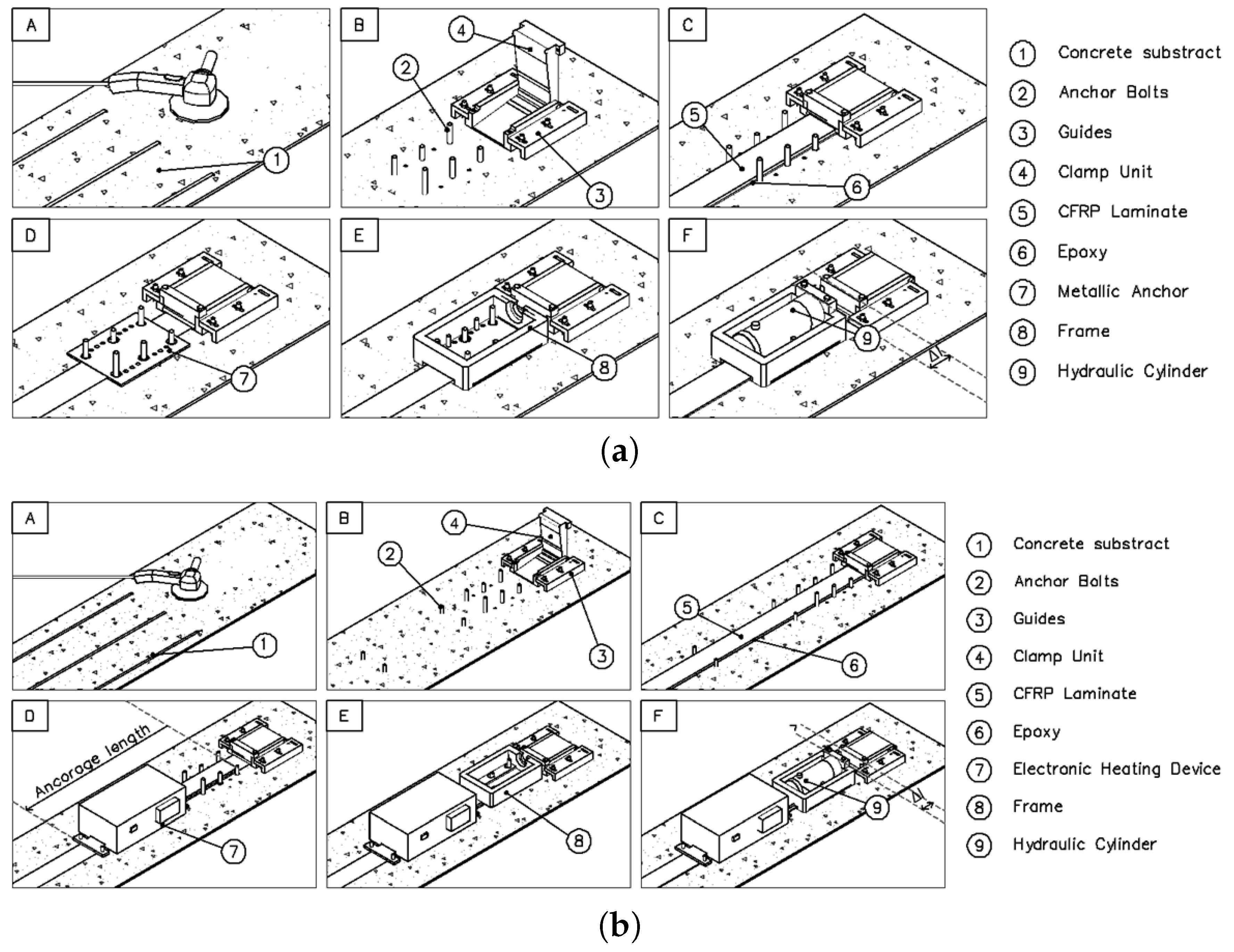 Equipment composing the anchorage systems: (a) metallic plate anchors (MA); (b) guides (MA&GA); (c) clamp unit (MA&GA); (d) frame (MA&GA); (e) hydraulic hoses (MA&GA); (f) hydraulic cylinder (MA&GA); (g) manual hydraulic pump (MA&GA); (h) manometer and valves (GA); (i) heating device (GA).